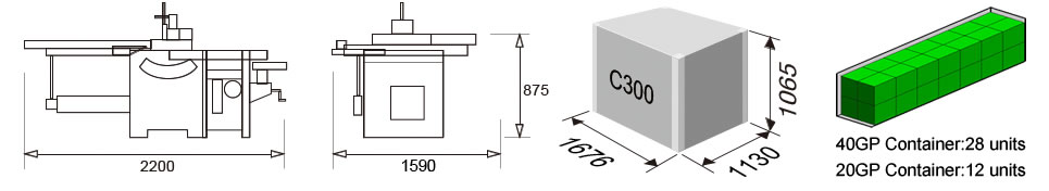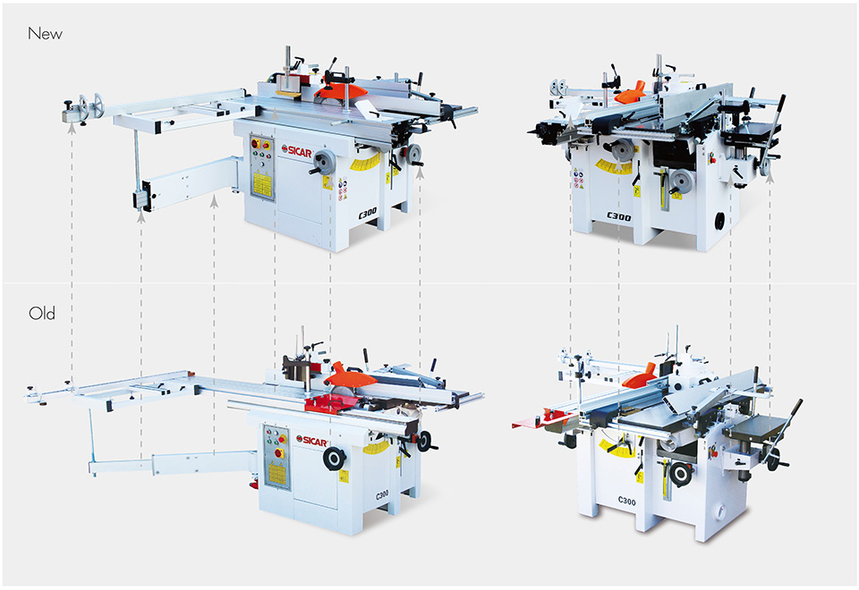 Le nostre Combinate C300 7L hanno un robusto telaio in lamiera di acciaio piegata ed elettrosaldata, verniciato a polveri interno ed esterno cotte a 200 gradi, piani in ghisa normalizzata di grosso spessore rettificata, tutto il materiale è certificato, montano 3 motori auto frenanti protetti singolarmente che, possono variare la potenza da 2hp,a 4hp secondo la richiesta. Il carro e di alluminio fresato e anodizzato di grosso spessore, può variare di lunghezza secondo il modello o le richieste, corre su sfere di acciaio e pista di acciaio, ed è regolabile sulla scorrevolezza. . Il toupie può avere l’albero di diametro voluto, ha 4 velocità di serie, la cuffia è di grosse dimensioni in pressofusione di alluminio regolabile su i due lati in maniera indipendente, le righe della cuffia sono in alluminio anodizzato e fresato sulla parte a contatto del legno e regolabili. Il gruppo sega è costruito in acciaio di grosso spessore montato su settori di materiale sinterizzato ed é inclinabile con volantino da 90° a 45° con battute regolabili, la lama della sega ha il diametro 250mm con foro 30mm il sollevamento della stessa è con leva ammortizzata. L’incisore è di serie e porta un diametro 90mm con foro 22mm, è regolabile sia in altezza sia longitudinalmente. Riga di taglio parallelo in alluminio anodizzato fresata su due lati, con doppia lettura. Riga per piallare indipendente di grosse dimensioni in alluminio anodizzato, fresata, inclinabile da 90° a 45° con lettura e regolazione di battuta. Riga per squadrare in alluminio anodizzato, fresata su due facce, allungabile fino a 3200mm con lettura regolabile in acciaio inossidabile e numeri incisi in nero, doppia battuta girevole di facile regolazione. Il piano di appoggio legno é costruito in tubolare elettrosaldato, ed è sorretto da una bandiera sfilabile con regolazione eccentrica. Tutte le prese di aspirazione sono di diametro di 120 mm.